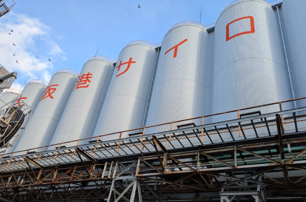 サイロでは食糧用小麦を専門に扱っており、小麦専用サイロは大阪屈指の規模を誇ります。輸入小麦や北海道産小麦を運搬船より吸い上げ、合計約5万5千トンの収容能力があるサイロに安全に保管されています。